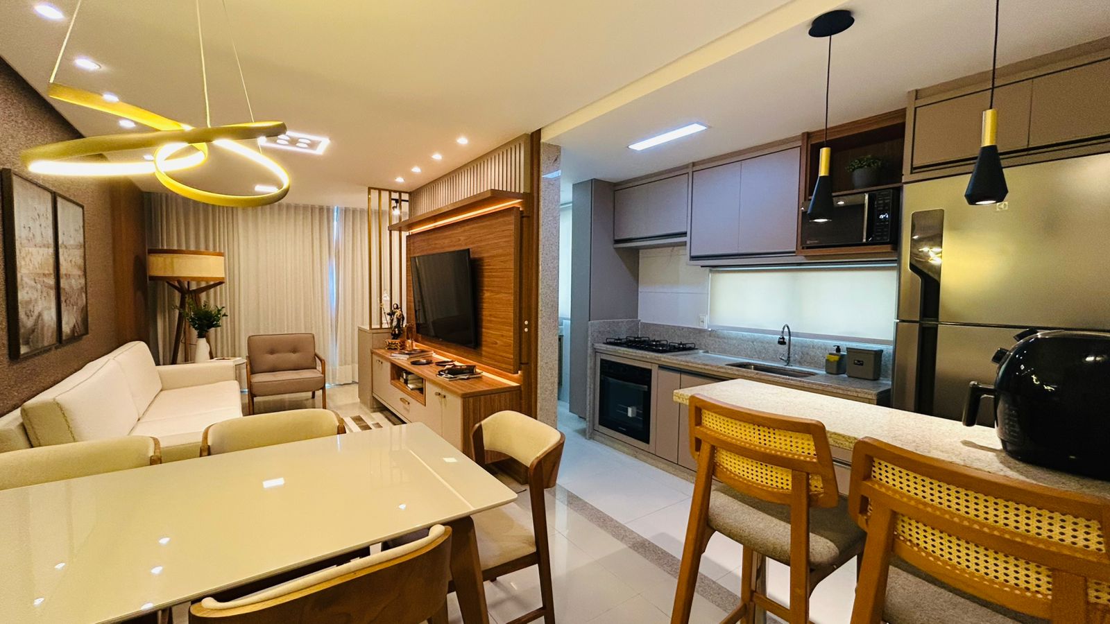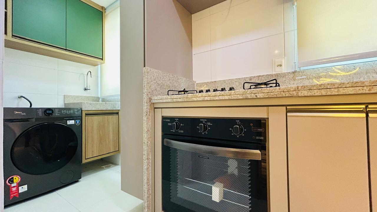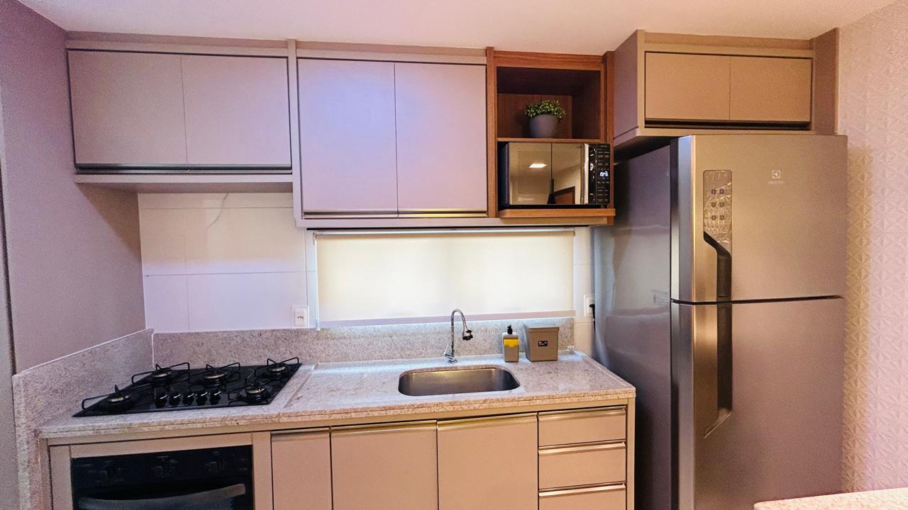 • Cozinha totalmente equipada com cooktop, forno elétrico, micro-ondas e geladeira, tudo novo e moderno.